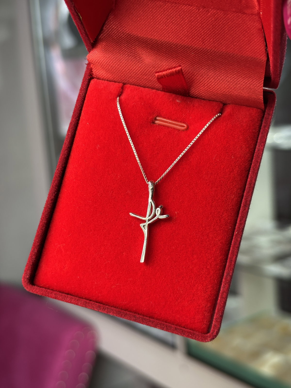 Es una gargantilla que mide 50 cm y el dije no puede ser cambiado.
